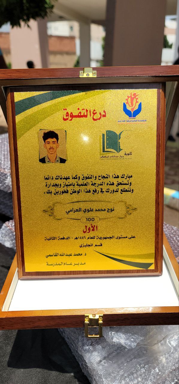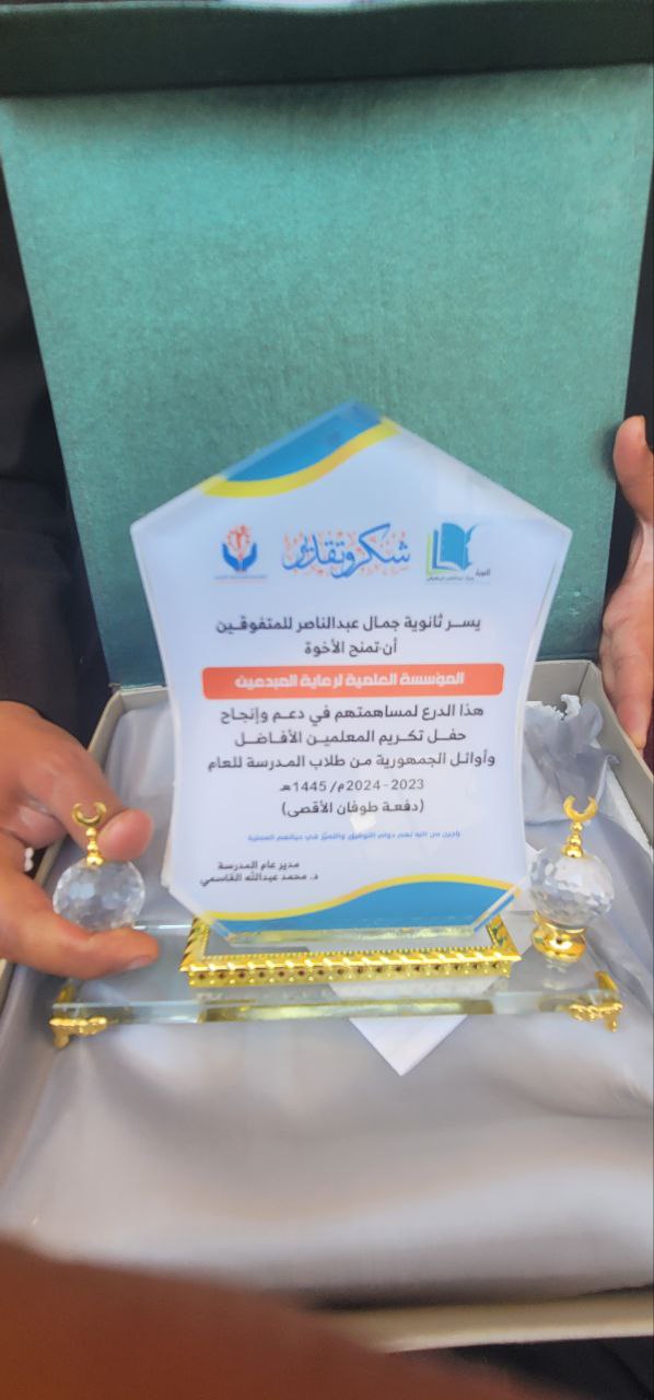 برعاية كريمة من المؤسسة العلمية لرعاية المبدعين وبرئاسة الاستاذ عبدالله احمد جحاف قامة المؤسسة العلمية بتكريم الاطلاب الأوائل على مستوى الجمهورية في ثانوية جمال عبدالناصر للمتفوقين وتكريم المعلمين الافاضل صناع التفوق وتسليم درع التفوق والنجاح تقديرا للجهود المبذولة في الجانب العلمي ولحصولهم على المراكز الأولى على مستوى الجمهورية وتزامنا مع ذكرى المولد النبوي الشريف على صاحبها وآله الصلاه والسلام قامت ثانوية جمال عبدالناصر للمتفوقين بالشراكة مع المؤسسة العلمية لرعاية المبدعين بإقامة حفل تكريم اوائل الجمهورية الدفعة التاسعة ١٤٤٥هجري دفعة طوفان الأقصى